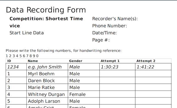 If you want to assign Heats/Lanes to the competitors at the last minute (e.g. at the track) you can print a paper copy of all of the people who are signed up for the event, and then assign them to heats/lanes using a laptop at the track.